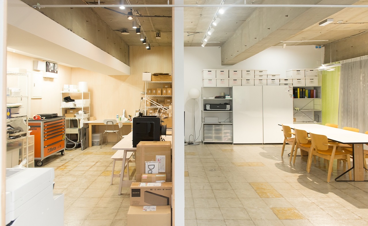 芝浦に立地する「第3東運ビル」の2階に入居する「&(アンド)デザイン」。プロダクトデザインを手掛ける同社のオフィスは、執務・ミーティング・製作という3つの機能がゆるやかに結ばれる。そのゾーニングは、考えて、話し合って、創る、というプロセスの具現化でもある。クリエイティビティを刺激するオフィスも、ものづくりに必要な要素だ。「広くて、増員したスタッフと在庫を収容できて、リノベーションもできるネイキッドな物件」という要望は、40年超の歴史を持つ倉庫ビルによって叶えられた。